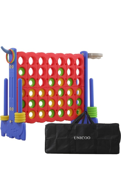 Oversized version of the "Connect Four" board game. It is best played on a table top. Two players play until one has accomplished "connect four" with the oversized chips.